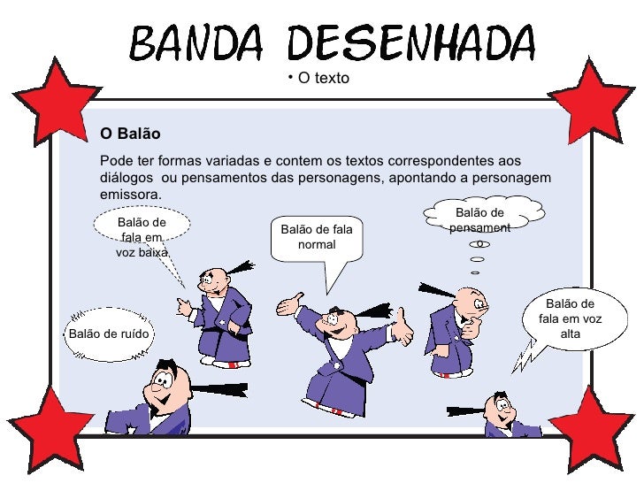 4. 5. Balão de fala em voz baixa Balão de pensamento <ul><li>O texto </li></ul>O Balão Pode ter formas variadas e contem os textos correspondentes aos diálogos ou pensamentos das personagens, apontando a personagem emissora. Balão de fala normal Balão de ruído Balão de fala em voz alta