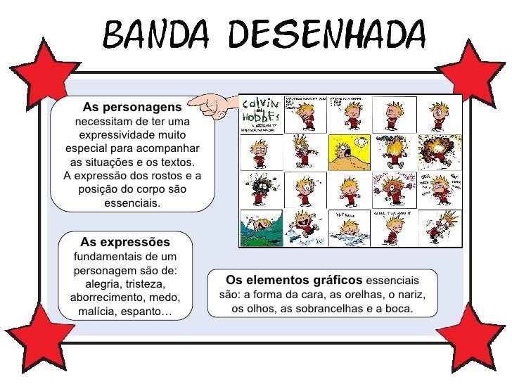 6. 7. As personagens necessitam de ter uma expressividade muito especial para acompanhar as situações e os textos. A expressão dos rostos e a posição do corpo são essenciais. As expressões fundamentais de um personagem são de: alegria, tristeza, aborrecimento, medo, malícia, espanto… Os elementos gráficos essenciais são: a forma da cara, as orelhas, o nariz, os olhos, as sobrancelhas e a boca.