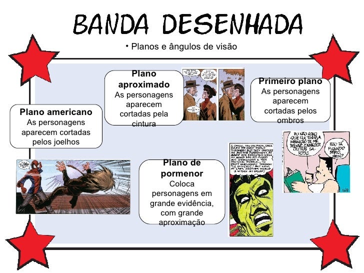 8. 9. <ul><li>Planos e ângulos de visão </li></ul>Plano americano As personagens aparecem cortadas pelos joelhos Plano aproximado As personagens aparecem cortadas pela cintura Plano de pormenor Coloca personagens em grande evidência, com grande aproximação Primeiro plano As personagens aparecem cortadas pelos ombros