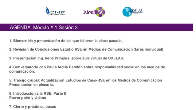 2. 2. AGENDA Módulo # 1 Sesión 3 1. Bienvenida y presentación de los que faltaron la clase pasada. 2. Revisión de Conclusiones Estudio RSE en Medios de Comunicación (tarea individual) 3. Presentación Ing. Irene Pringles, sobre aula virtual de UDELAS. 4. Conversatorio con Paula Ardila Rendón sobre responsabilidad social en los medios de comunicación. 5. Trabajo grupal: Actualización Estudios de Caso-RSE en los Medios de Comunicación Presentación en plenaria. 6. Introducción a la RSE: Parte II Power point y videos 7. Cierre y próximos pasos