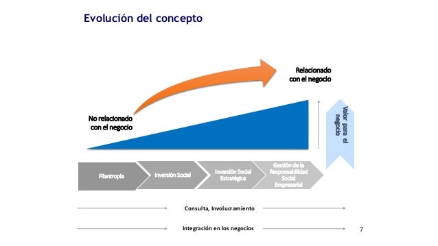 7. 7. 7 Filantropía Inversión Social Inversión Social Estratégica Gestión de la Responsabilidad Social Empresarial Consulta, Involucramiento Integración en los negocios Valorparael negocio Relacionado con el negocio No relacionado con el negocio Evolución del concepto