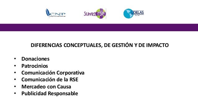 8. 8. DIFERENCIAS CONCEPTUALES, DE GESTIÓN Y DE IMPACTO • Donaciones • Patrocinios • Comunicación Corporativa • Comunicación de la RSE • Mercadeo con Causa • Publicidad Responsable