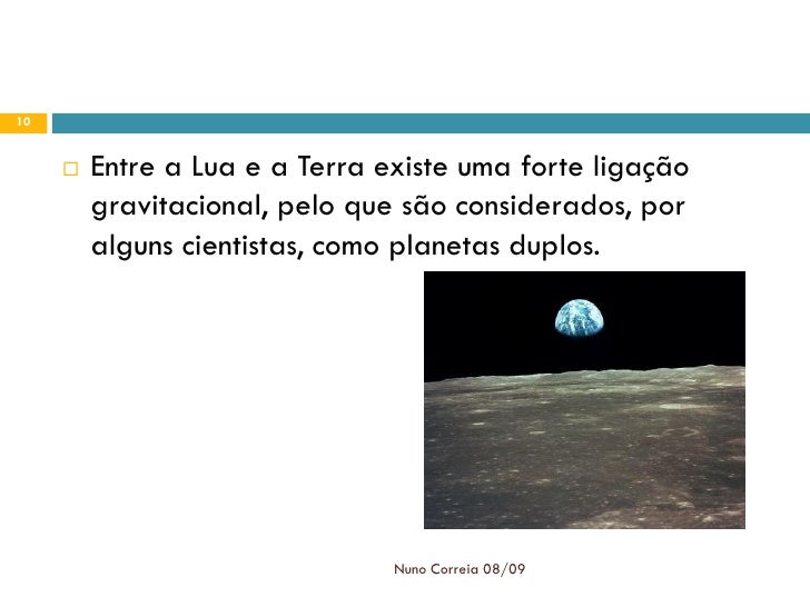 10. 10. 10  Entre a Lua e a Terra existe uma forte ligação gravitacional, pelo que são considerados, por alguns cientistas, como planetas duplos. Nuno Correia 08/09