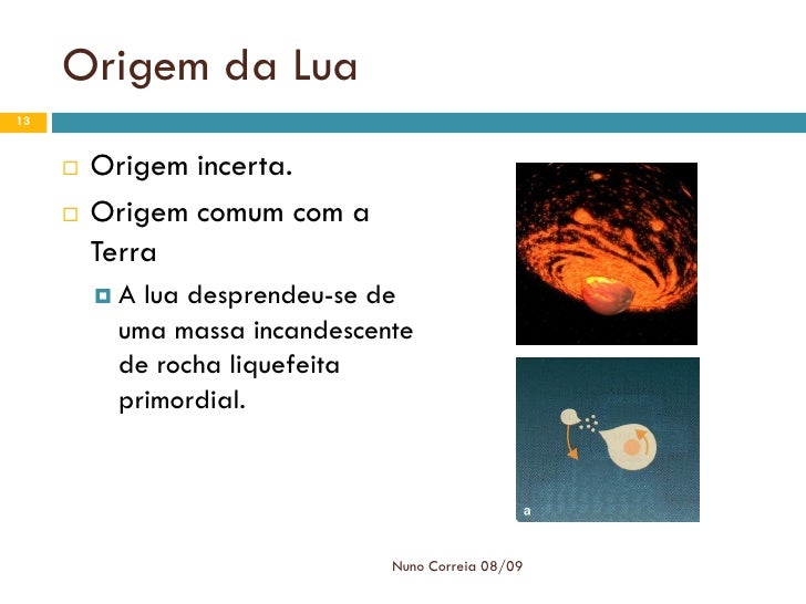 13. 13. Origem da Lua 13  Origem incerta.  Origem comum com a Terra A lua desprendeu-se de uma massa incandescente de rocha liquefeita primordial. Nuno Correia 08/09