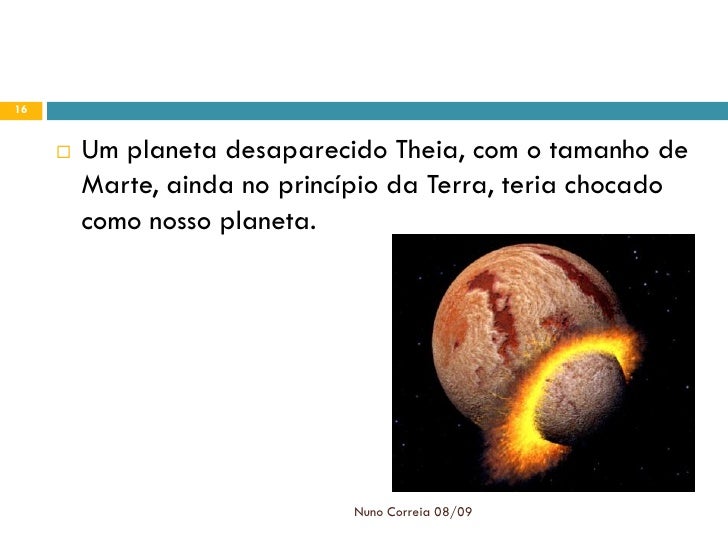 16. 16. 16  Um planeta desaparecido Theia, com o tamanho de Marte, ainda no princípio da Terra, teria chocado como nosso planeta. Nuno Correia 08/09