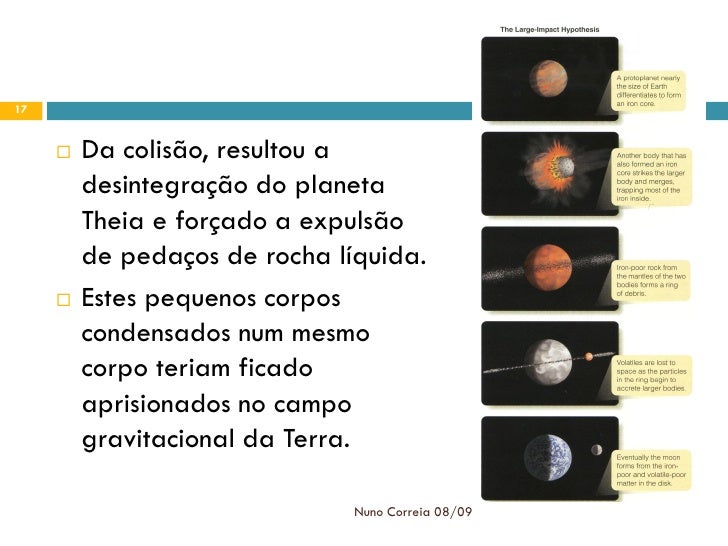 17. 17. 17  Da colisão, resultou a desintegração do planeta Theia e forçado a expulsão de pedaços de rocha líquida.  Estes pequenos corpos condensados num mesmo corpo teriam ficado aprisionados no campo gravitacional da Terra. Nuno Correia 08/09