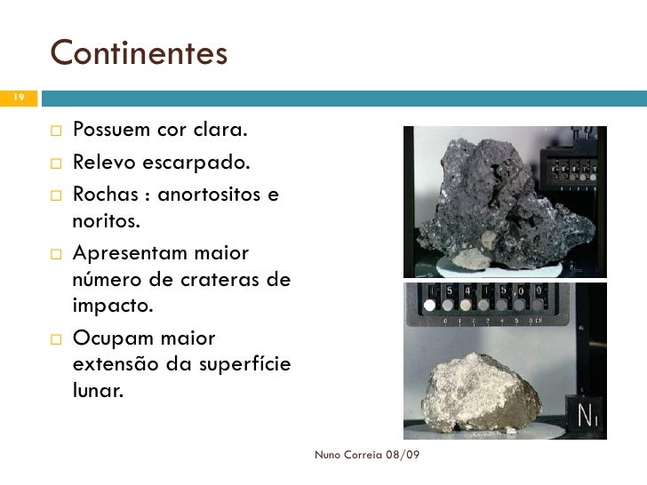 19. 19. Continentes 19  Possuem cor clara.  Relevo escarpado.  Rochas : anortositos e noritos.  Apresentam maior número de crateras de impacto.  Ocupam maior extensão da superfície lunar. Nuno Correia 08/09