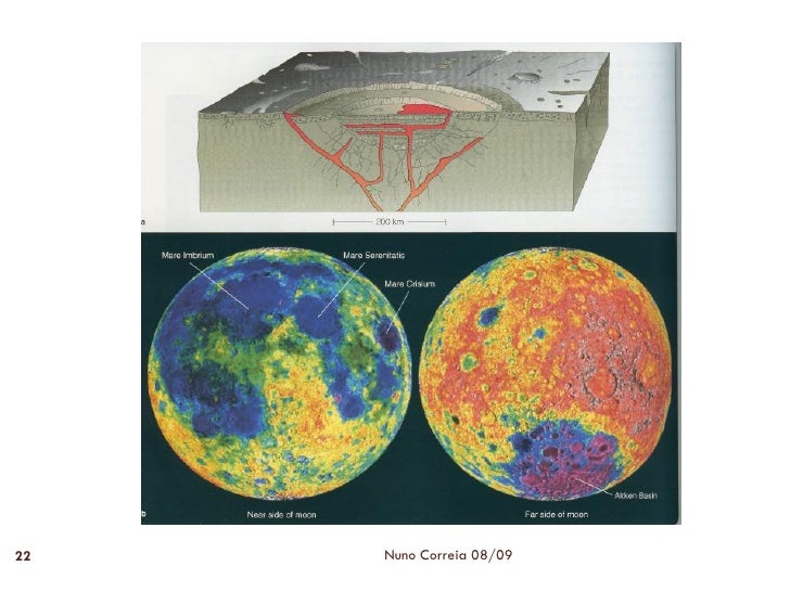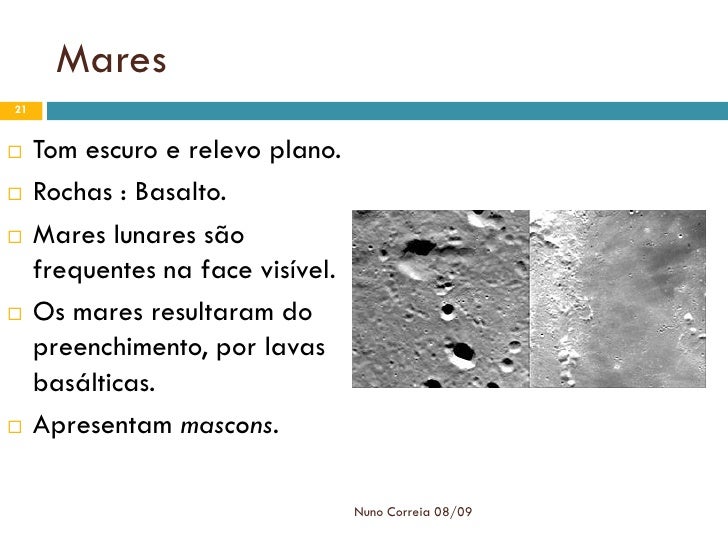 21. 21. Mares 21  Tom escuro e relevo plano.  Rochas : Basalto.  Mares lunares são frequentes na face visível.  Os mares resultaram do preenchimento, por lavas basálticas.  Apresentam mascons. Nuno Correia 08/09