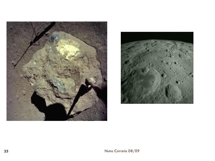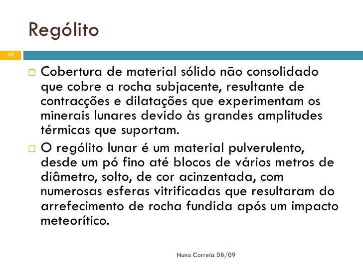 30. 30. Rególito 30  Cobertura de material sólido não consolidado que cobre a rocha subjacente, resultante de contracções e dilatações que experimentam os minerais lunares devido às grandes amplitudes térmicas que suportam.  O rególito lunar é um material pulverulento, desde um pó fino até blocos de vários metros de diâmetro, solto, de cor acinzentada, com numerosas esferas vitrificadas que resultaram do arrefecimento de rocha fundida após um impacto meteorítico. Nuno Correia 08/09
