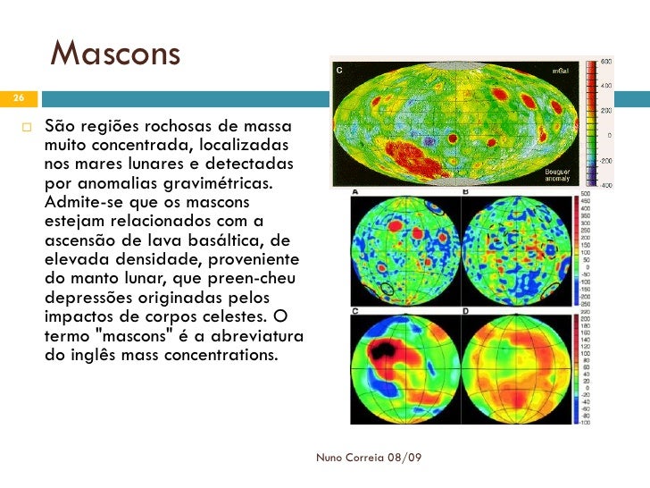26. 26. Mascons 26  São regiões rochosas de massa muito concentrada, localizadas nos mares lunares e detectadas por anomalias gravimétricas. Admite-se que os mascons estejam relacionados com a ascensão de lava basáltica, de elevada densidade, proveniente do manto lunar, que preen-cheu depressões originadas pelos impactos de corpos celestes. O termo quot;masconsquot; é a abreviatura do inglês mass concentrations. Nuno Correia 08/09