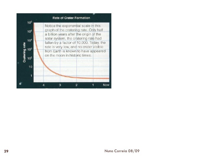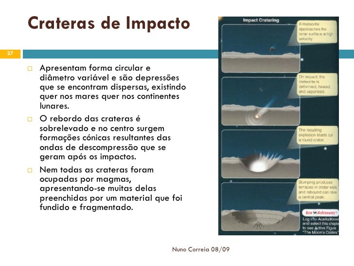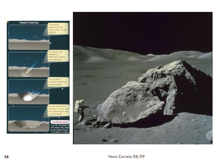 27. 27. Crateras de Impacto 27  Apresentam forma circular e diâmetro variável e são depressões que se encontram dispersas, existindo quer nos mares quer nos continentes lunares.  O rebordo das crateras é sobrelevado e no centro surgem formações cónicas resultantes das ondas de descompressão que se geram após os impactos.  Nem todas as crateras foram ocupadas por magmas, apresentando-se muitas delas preenchidas por um material que foi fundido e fragmentado. Nuno Correia 08/09
