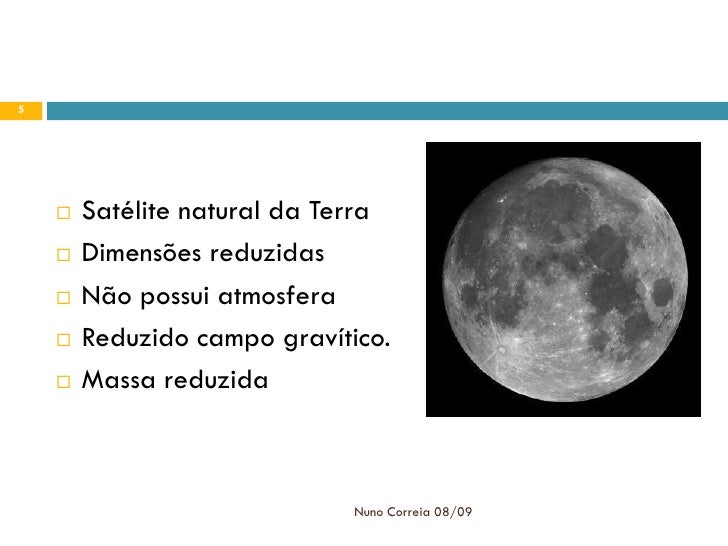 5. 5. 5  Satélite natural da Terra  Dimensões reduzidas  Não possui atmosfera  Reduzido campo gravítico.  Massa reduzida Nuno Correia 08/09