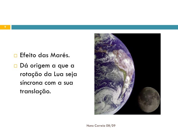 9. 9. 9  Efeito das Marés.  Dá origem a que a rotação da Lua seja síncrona com a sua translação. Nuno Correia 08/09
