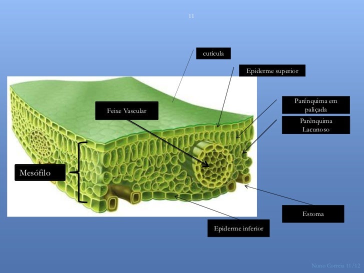 10. 10. 11 cutícula Epiderme superior Parênquima em Feixe Vascular paliçada Parênquima LacunosoMesófilo Estoma Epiderme inferior Nuno Correia 11/12