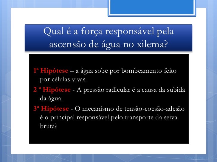19. 19. Qual é a força responsável pela ascensão de água no xilema?1ª Hipótese – a água sobe por bombeamento feito por células vivas.2 ª Hipótese - A pressão radicular é a causa da subida da água.3ª Hipótese - O mecanismo de tensão-coesão-adesão é o principal responsável pelo transporte da seiva bruta? Nuno Correia 11/12