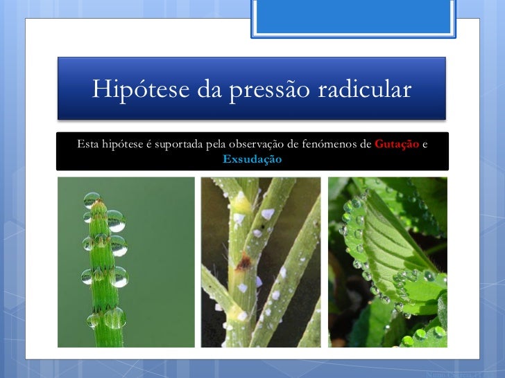  Esta  hipótese postula que existe uma pressão formada na  raiz (pressão radicular) que impele a seiva bruta para cima.A...