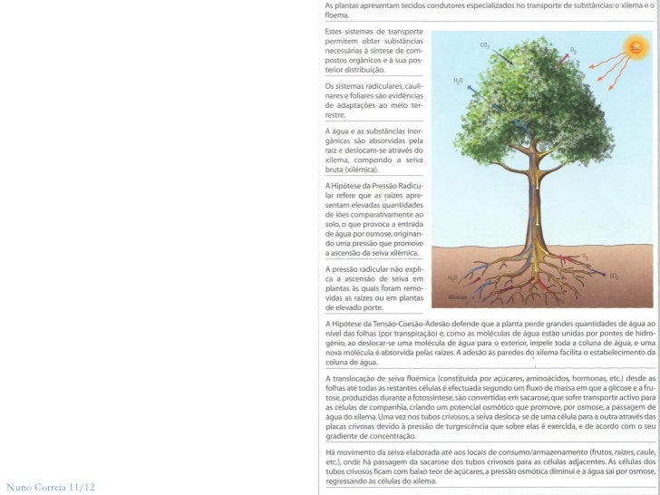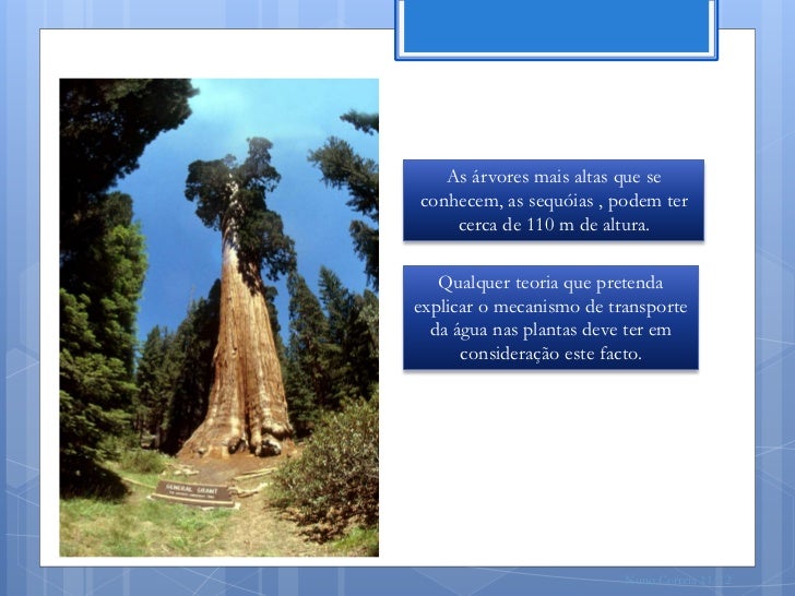 3. 3. As árvores mais altas que seconhecem, as sequóias , podem ter cerca de 110 m de altura. Qualquer teoria que pretendaexplicar o mecanismo de transporte da água nas plantas deve ter em consideração este facto. Nuno Correia 11/12