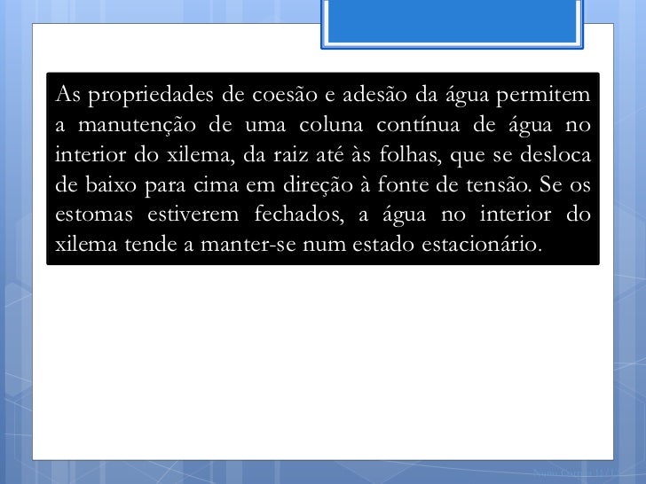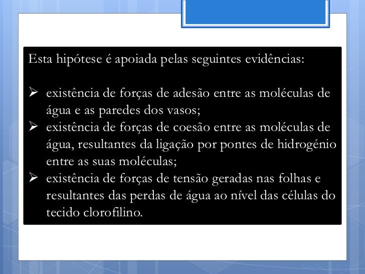 Esta hipótese é apoiada pelas seguintes evidências: existência de forças de adesão entre as moléculas de  água e as pared...