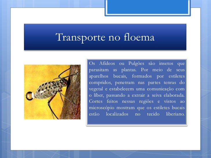 Transporte no floema      Os Afídeos ou Pulgões são insetos que      parasitam as plantas. Por meio de seus      aparelhos...