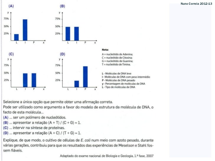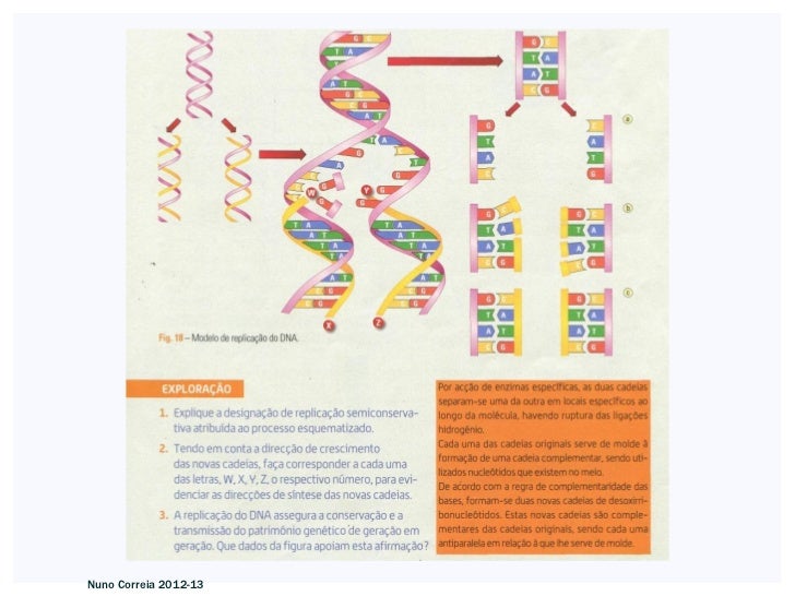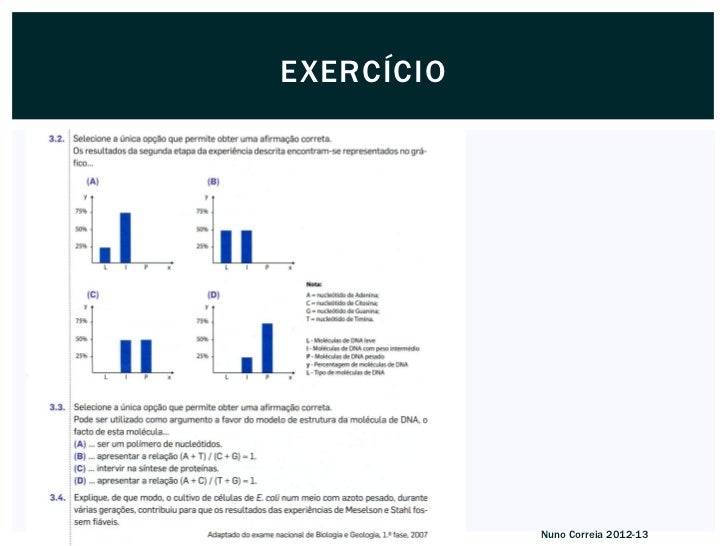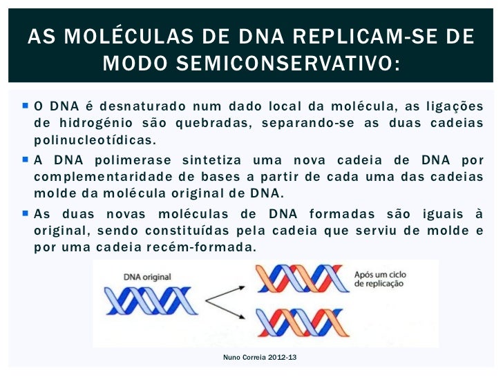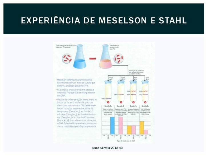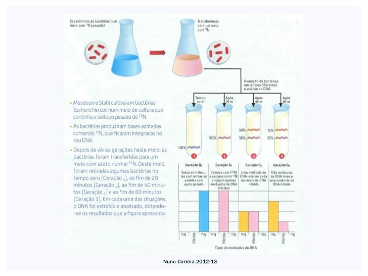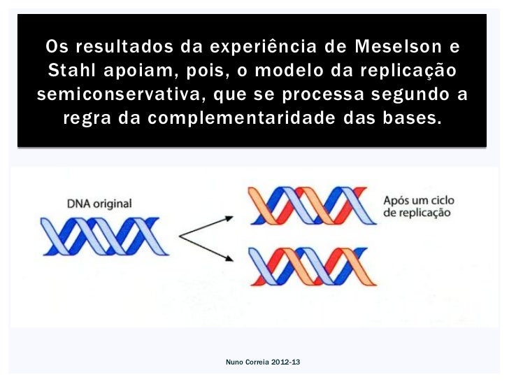 9. 9. Os resultados da experiência de Meselson e Stahl apoiam, pois, o modelo da replicaçãosemiconservativa, que se processa segundo a regra da complementaridade das bases. Nuno Correia 2012-13