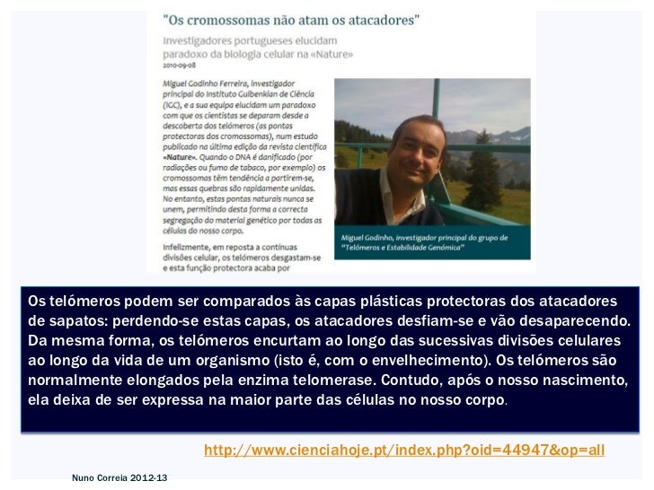 15. 15. Os telómeros podem ser comparados às capas plásticas protectoras dos atacadoresde sapatos: perdendo-se estas capas, os atacadores desfiam-se e vão desaparecendo.Da mesma forma, os telómeros encurtam ao longo das sucessivas divisões celularesao longo da vida de um organismo (isto é, com o envelhecimento). Os telómeros sãonormalmente elongados pela enzima telomerase. Contudo, após o nosso nascimento,ela deixa de ser expressa na maior parte das células no nosso corpo. http://www.cienciahoje.pt/index.php?oid=44947&op=all Nuno Correia 2012-13