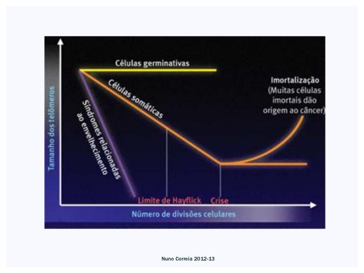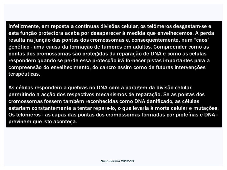 16. 16. Infelizmente, em reposta a contínuas divisões celular, os telómeros desgastam-se eesta função protectora acaba por desaparecer à medida que envelhecemos. A perdaresulta na junção das pontas dos cromossomas e, consequentemente, num “caos”genético - uma causa da formação de tumores em adultos. Compreender como aspontas dos cromossomas são protegidas da reparação de DNA e como as célulasrespondem quando se perde essa protecção irá fornecer pistas importantes para acompreensão do envelhecimento, do cancro assim como de futuras intervençõesterapêuticas.As células respondem a quebras no DNA com a paragem da divisão celular,permitindo a acção dos respectivos mecanismos de reparação. Se as pontas doscromossomas fossem também reconhecidas como DNA danificado, as célulasestariam constantemente a tentar repara-lo, o que levaria à morte celular e mutações.Os telómeros - as capas das pontas dos cromossomas formadas por proteínas e DNA -previnem que isto aconteça. Nuno Correia 2012-13