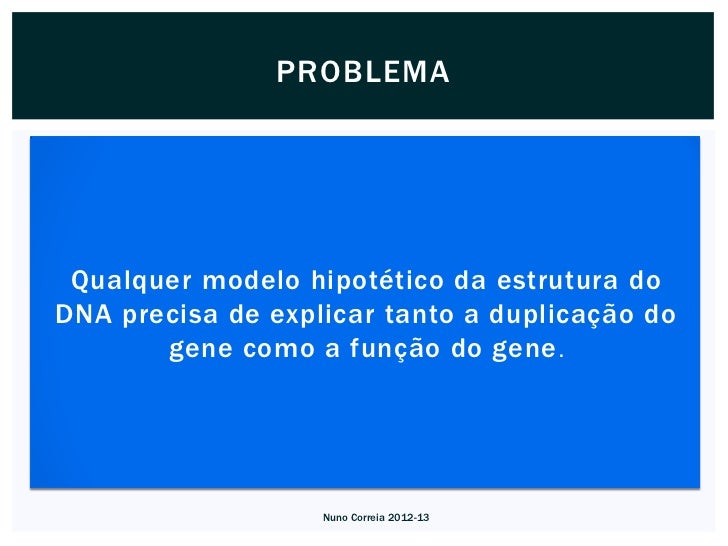 3. 3. PROBLEMA Qualquer modelo hipotético da estrutura doDNA precisa de explicar tanto a duplicação do gene como a função do gene . Nuno Correia 2012-13