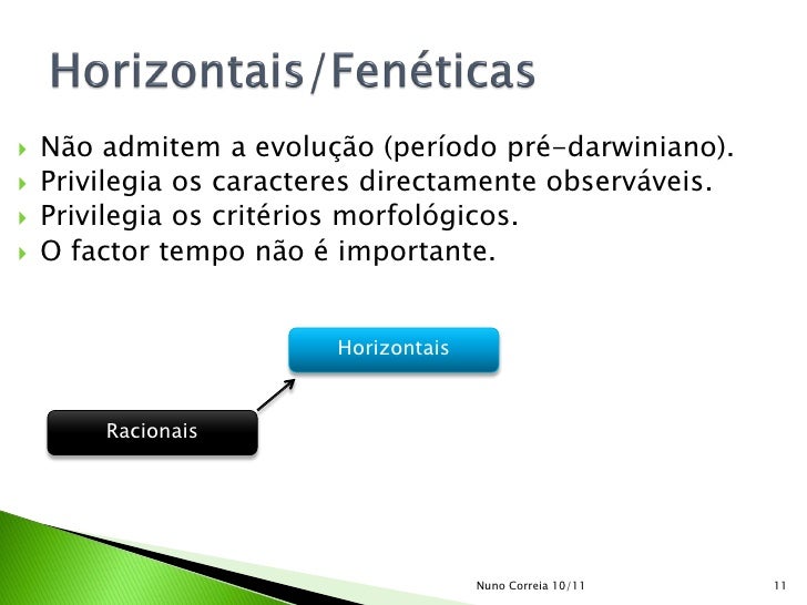 11. 11.  Não admitem a evolução (período pré-darwiniano). Privilegia os caracteres directamente observáveis. Privilegia os critérios morfológicos. O factor tempo não é importante. Horizontais Racionais Nuno Correia 10/11 11