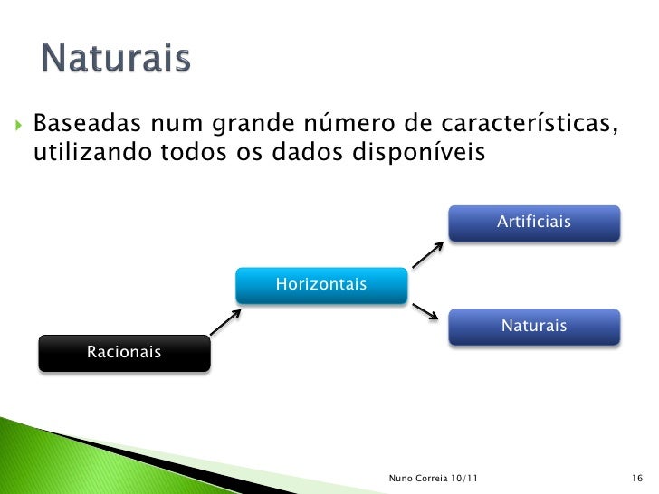 16. 16.  Baseadas num grande número de características, utilizando todos os dados disponíveis Artificiais Horizontais Naturais Racionais Nuno Correia 10/11 16