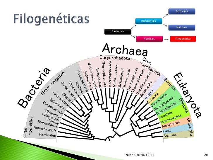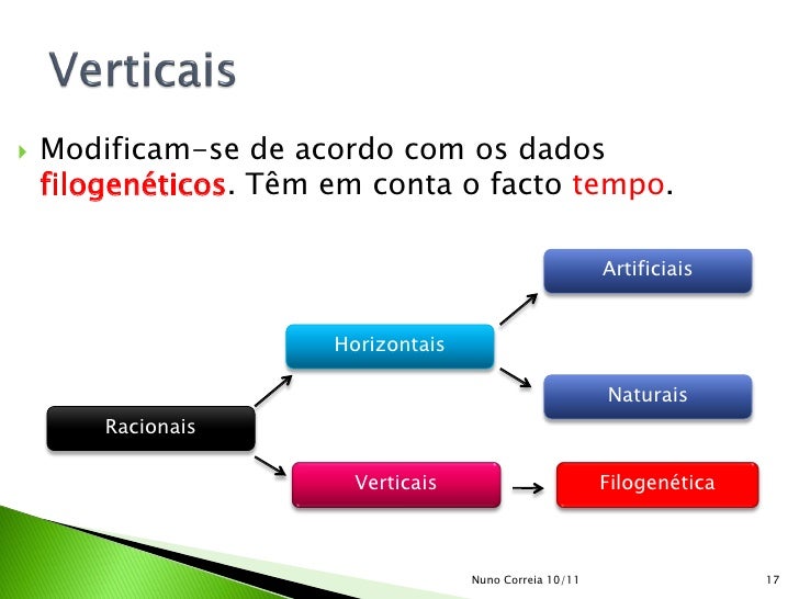 17. 17.  Modificam-se de acordo com os dados filogenéticos. Têm em conta o facto tempo. Artificiais Horizontais Naturais Racionais Verticais Filogenética Nuno Correia 10/11 17