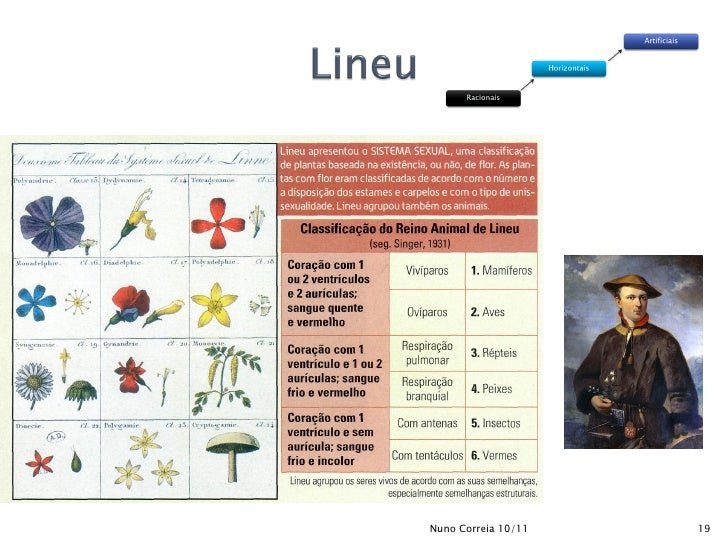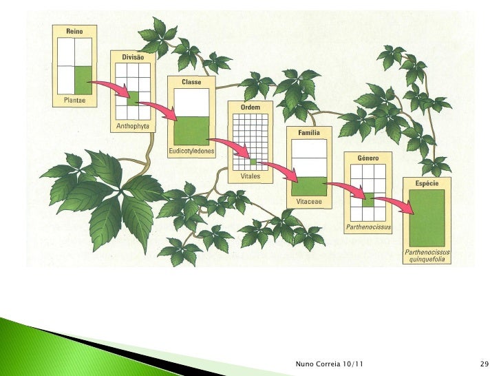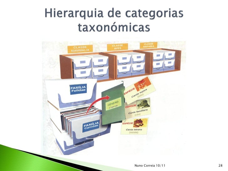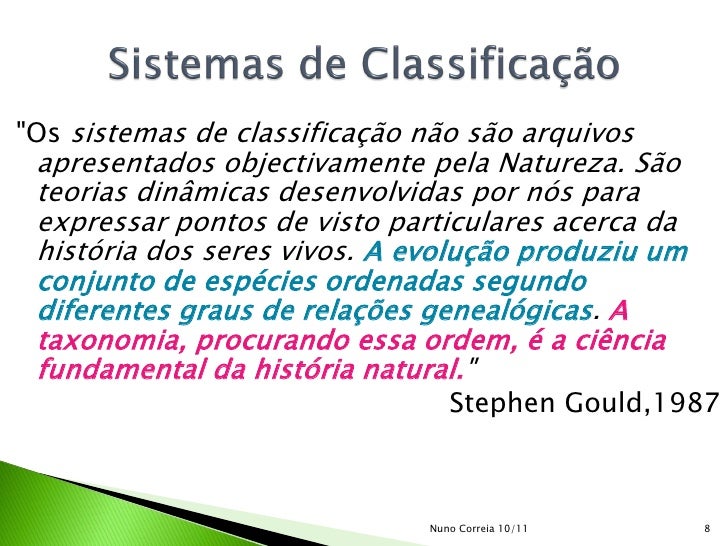 8. 8. "Os sistemas de classificação não são arquivos apresentados objectivamente pela Natureza. São teorias dinâmicas desenvolvidas por nós para expressar pontos de visto particulares acerca da história dos seres vivos. A evolução produziu um conjunto de espécies ordenadas segundo diferentes graus de relações genealógicas. A taxonomia, procurando essa ordem, é a ciência fundamental da história natural." Stephen Gould,1987 Nuno Correia 10/11 8