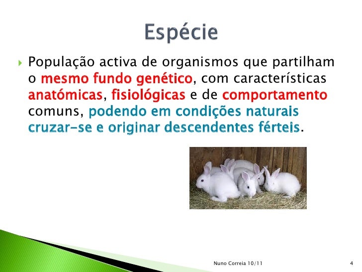 4. 4.  População activa de organismos que partilham o mesmo fundo genético, com características anatómicas, fisiológicas e de comportamento comuns, podendo em condições naturais cruzar-se e originar descendentes férteis. Nuno Correia 10/11 4