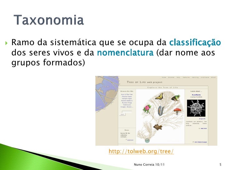 5. 5.  Ramo da sistemática que se ocupa da classificação dos seres vivos e da nomenclatura (dar nome aos grupos formados) http://tolweb.org/tree/ Nuno Correia 10/11 5