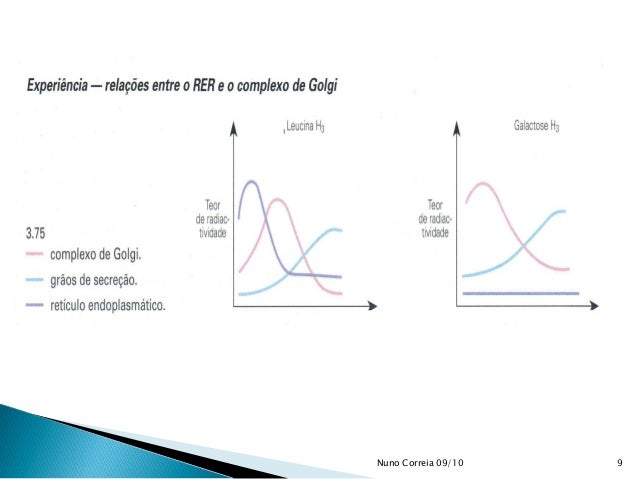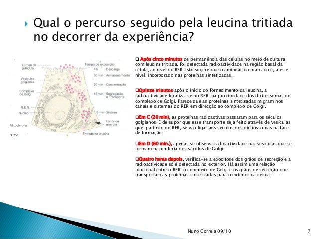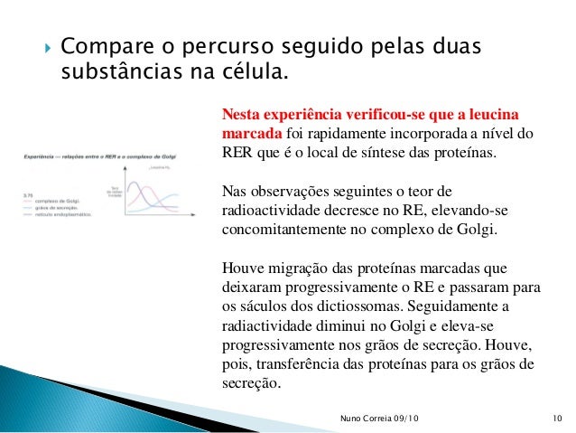 10. 10.  Compare o percurso seguido pelas duas substâncias na célula. Nesta experiência verificou-se que a leucina marcada foi rapidamente incorporada a nível do RER que é o local de síntese das proteínas. Nas observações seguintes o teor de radioactividade decresce no RE, elevando-se concomitantemente no complexo de Golgi. Houve migração das proteínas marcadas que deixaram progressivamente o RE e passaram para os sáculos dos dictiossomas. Seguidamente a radiactividade diminui no Golgi e eleva-se progressivamente nos grãos de secreção. Houve, pois, transferência das proteínas para os grãos de secreção. 10Nuno Correia 09/10