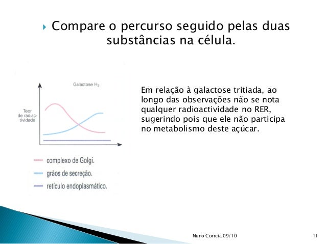 11. 11.  Compare o percurso seguido pelas duas substâncias na célula. Em relação à galactose tritiada, ao longo das observações não se nota qualquer radioactividade no RER, sugerindo pois que ele não participa no metabolismo deste açúcar. 11Nuno Correia 09/10
