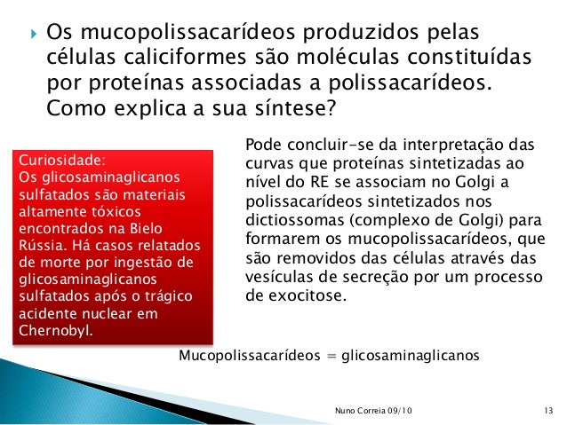 13. 13.  Os mucopolissacarídeos produzidos pelas células caliciformes são moléculas constituídas por proteínas associadas a polissacarídeos. Como explica a sua síntese? Pode concluir-se da interpretação das curvas que proteínas sintetizadas ao nível do RE se associam no Golgi a polissacarídeos sintetizados nos dictiossomas (complexo de Golgi) para formarem os mucopolissacarídeos, que são removidos das células através das vesículas de secreção por um processo de exocitose. Curiosidade: Os glicosaminaglicanos sulfatados são materiais altamente tóxicos encontrados na Bielo Rússia. Há casos relatados de morte por ingestão de glicosaminaglicanos sulfatados após o trágico acidente nuclear em Chernobyl. Mucopolissacarídeos = glicosaminaglicanos 13Nuno Correia 09/10
