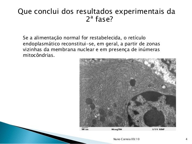 4. 4. Que conclui dos resultados experimentais da 2ª fase? Se a alimentação normal for restabelecida, o retículo endoplasmático reconstitui-se, em geral, a partir de zonas vizinhas da membrana nuclear e em presença de inúmeras mitocôndrias. 4Nuno Correia 09/10