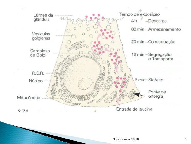 5. 5.  A um rato previamente sujeito a jejum foi extraído o pâncreas e cortado em fatias finas que foram colocadas num meio de cultura que continha um aminoácido marcado, a leucina tritiada).  Após algum tempo de exposição, fez-se a localização da leucina radioactiva nas células, tendo sido seguidamente o tecido transferido para um meio de cultura contendo leucina não radioactiva.  Periodicamente, foram realizados novos testes para localização de sinais de radioactividade.  Os resultados obtidos estão registados na figura. 5Nuno Correia 09/10