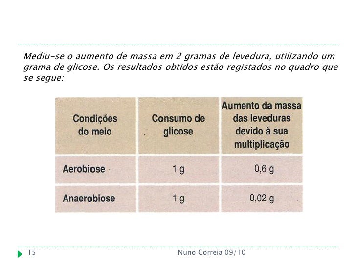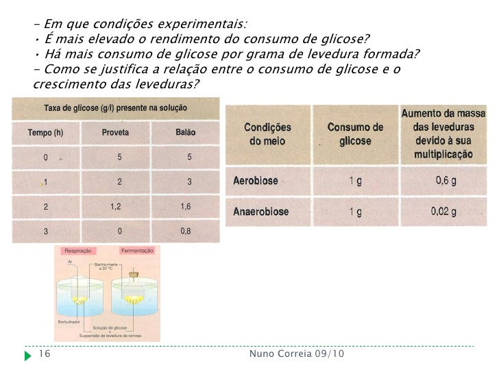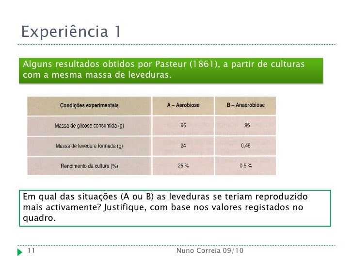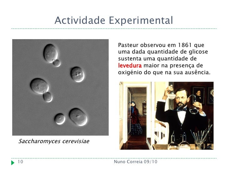 10. 10. Actividade Experimental Pasteur observou em 1861 que uma dada quantidade de glicose sustenta uma quantidade de levedura maior na presença de oxigénio do que na sua ausência. Saccharomyces cerevisiae 10 Nuno Correia 09/10