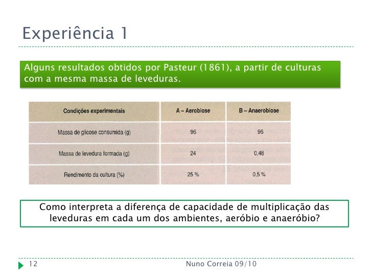 12. 12. Experiência 1 Alguns resultados obtidos por Pasteur (1861), a partir de culturas com a mesma massa de leveduras. Como interpreta a diferença de capacidade de multiplicação das leveduras em cada um dos ambientes, aeróbio e anaeróbio? 12 Nuno Correia 09/10