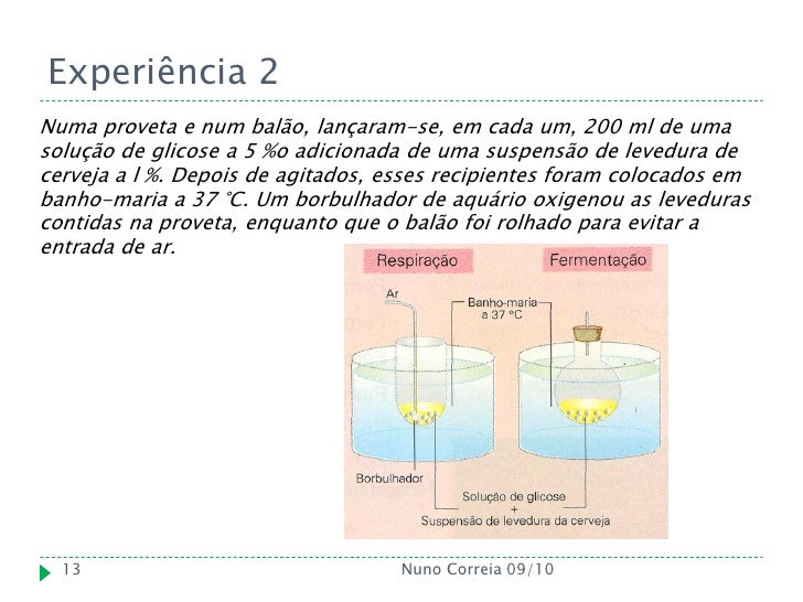 13. 13. Experiência 2 Numa proveta e num balão, lançaram-se, em cada um, 200 ml de uma solução de glicose a 5 %o adicionada de uma suspensão de levedura de cerveja a l %. Depois de agitados, esses recipientes foram colocados em banho-maria a 37 °C. Um borbulhador de aquário oxigenou as leveduras contidas na proveta, enquanto que o balão foi rolhado para evitar a entrada de ar. 13 Nuno Correia 09/10