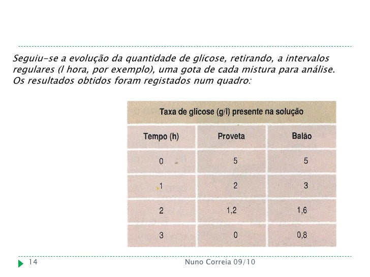 14. 14. Seguiu-se a evolução da quantidade de glicose, retirando, a intervalos regulares (l hora, por exemplo), uma gota de cada mistura para análise. Os resultados obtidos foram registados num quadro: 14 Nuno Correia 09/10