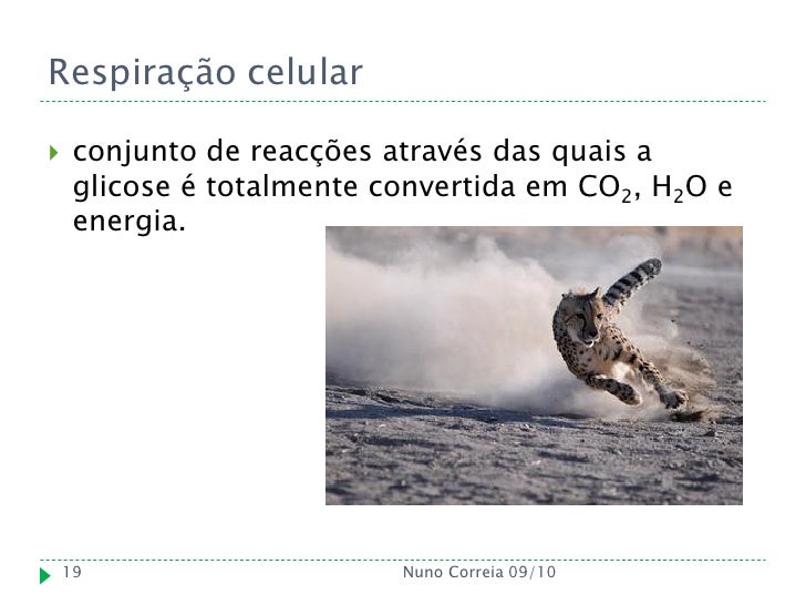 19. 19. Respiração celular  conjunto de reacções através das quais a glicose é totalmente convertida em CO2, H2O e energia. 19 Nuno Correia 09/10