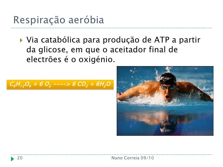 20. 20. Respiração aeróbia  Via catabólica para produção de ATP a partir da glicose, em que o aceitador final de electrões é o oxigénio. C6H12O6 + 6 O2 ----> 6 CO2 + 6H2O 20 Nuno Correia 09/10