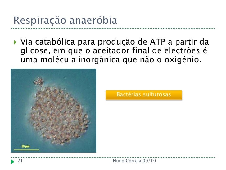 21. 21. Respiração anaeróbia  Via catabólica para produção de ATP a partir da glicose, em que o aceitador final de electrões é uma molécula inorgânica que não o oxigénio. Bactérias sulfurosas 21 Nuno Correia 09/10