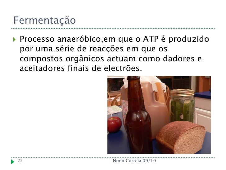 22. 22. Fermentação  Processo anaeróbico,em que o ATP é produzido por uma série de reacções em que os compostos orgânicos actuam como dadores e aceitadores finais de electrões. 22 Nuno Correia 09/10