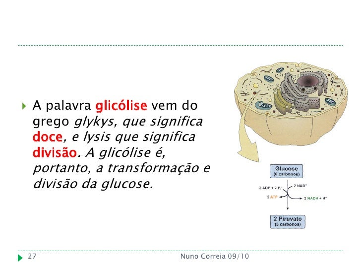 27. 27.  A palavra glicólise vem do grego glykys, que significa doce, e lysis que significa divisão. A glicólise é, portanto, a transformação e divisão da glucose. 27 Nuno Correia 09/10