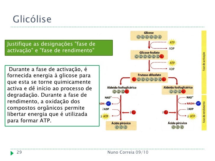 29. 29. Glicólise Justifique as designações "fase de activação" e "fase de rendimento" Durante a fase de activação, é fornecida energia à glicose para que esta se torne quimicamente activa e dê início ao processo de degradação. Durante a fase de rendimento, a oxidação dos compostos orgânicos permite libertar energia que é utilizada para formar ATP. 29 Nuno Correia 09/10
