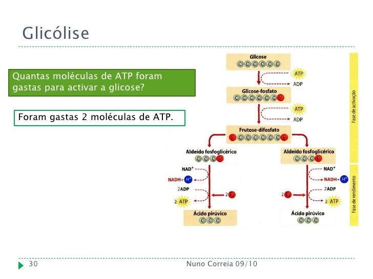 30. 30. Glicólise Quantas moléculas de ATP foram gastas para activar a glicose? Foram gastas 2 moléculas de ATP. 30 Nuno Correia 09/10