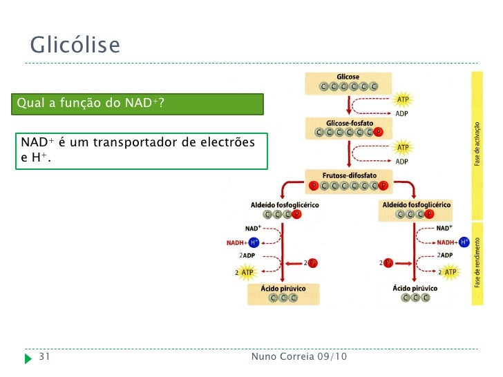 31. 31. Glicólise Qual a função do NAD+? NAD+ é um transportador de electrões e H+. 31 Nuno Correia 09/10